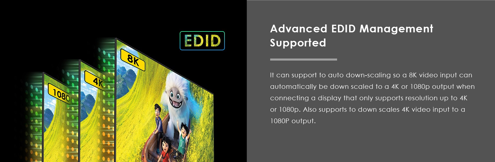Díky automatickému EDID down-scalingu může být na výstupu připojen monitor s rozlišením 8K, 4K nebo FULL HD 1080p