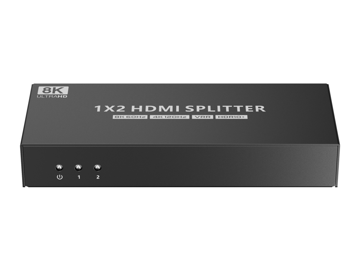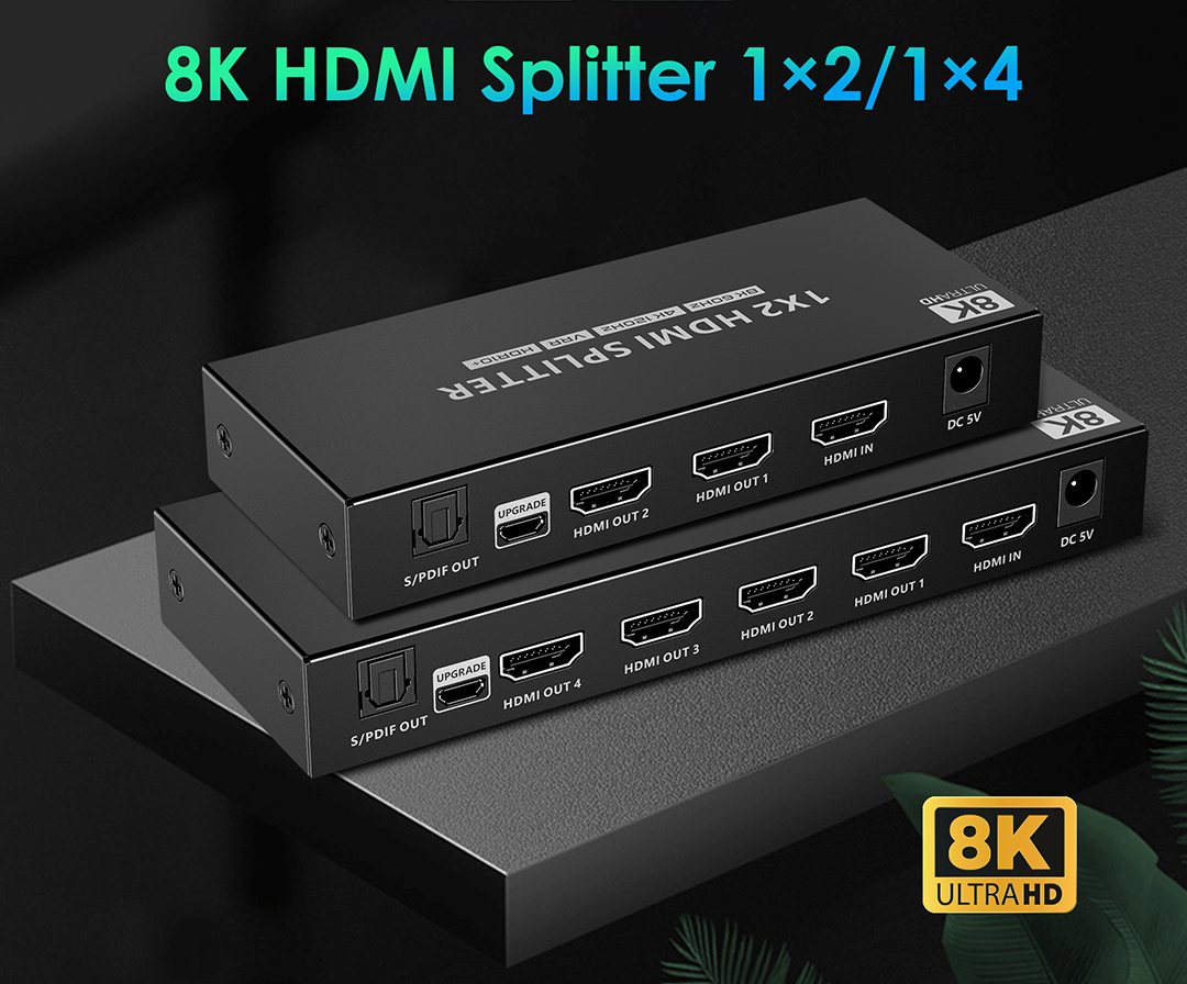 HDMI 2.1 splitter 1-4 porty, 8K@60Hz, 4K@120Hz, 1080p, HDR+ zapojí čtyři HDMI obrazovky k jednomu HDMI zdroji signálu jako je PC, notebook, DVD, set top box, EDID down-scaling umožňuje připojit na výstupu monitory s rozlišením 8K, 4K nebo 1080p