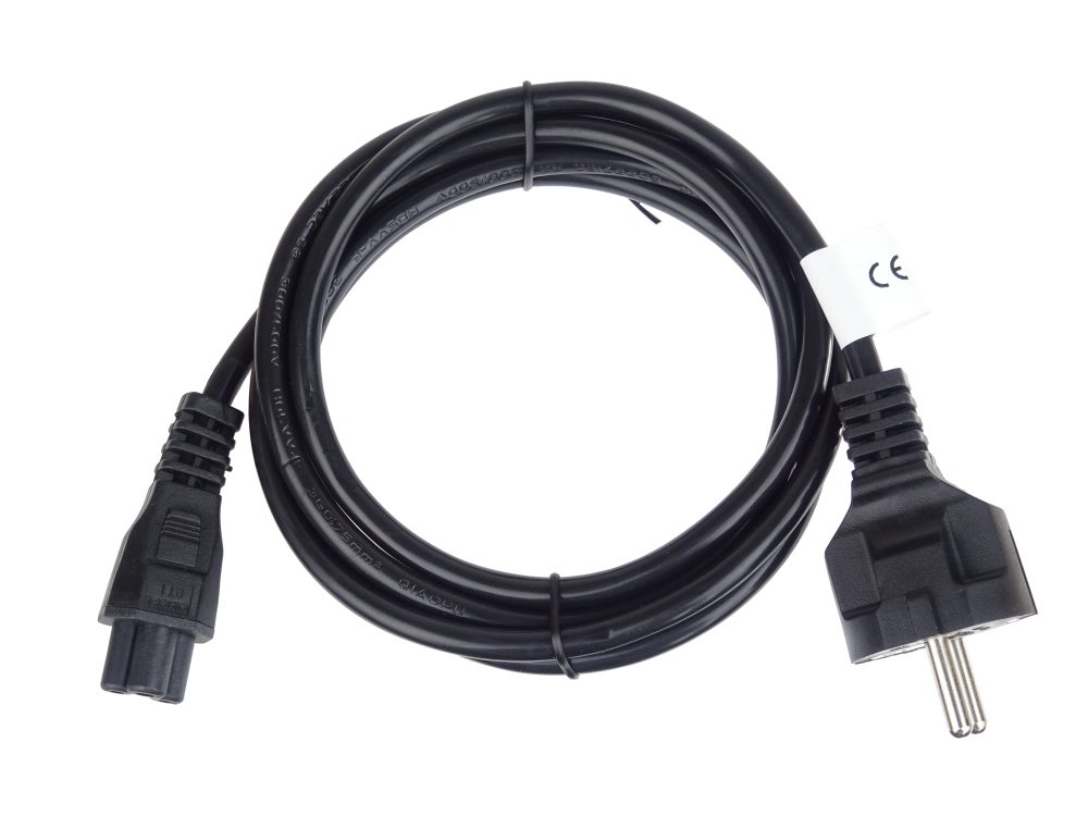 Napájecí kabel v černém provedení pro notebook. Třížilový kabel je zakončený zástrčkou typu "Mickey mouse" IEC 320 C5, průřez vodiče: 3x0,75mm2, proudové zatížení: max 10A, maximální napětí: 250V, barevné provedení: černé, délka kabelu: 2m