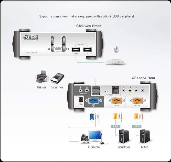 ATEN 2-port KVMP USB+PS/2, usb hub, audio, 1.2m kabely CS-1732A
