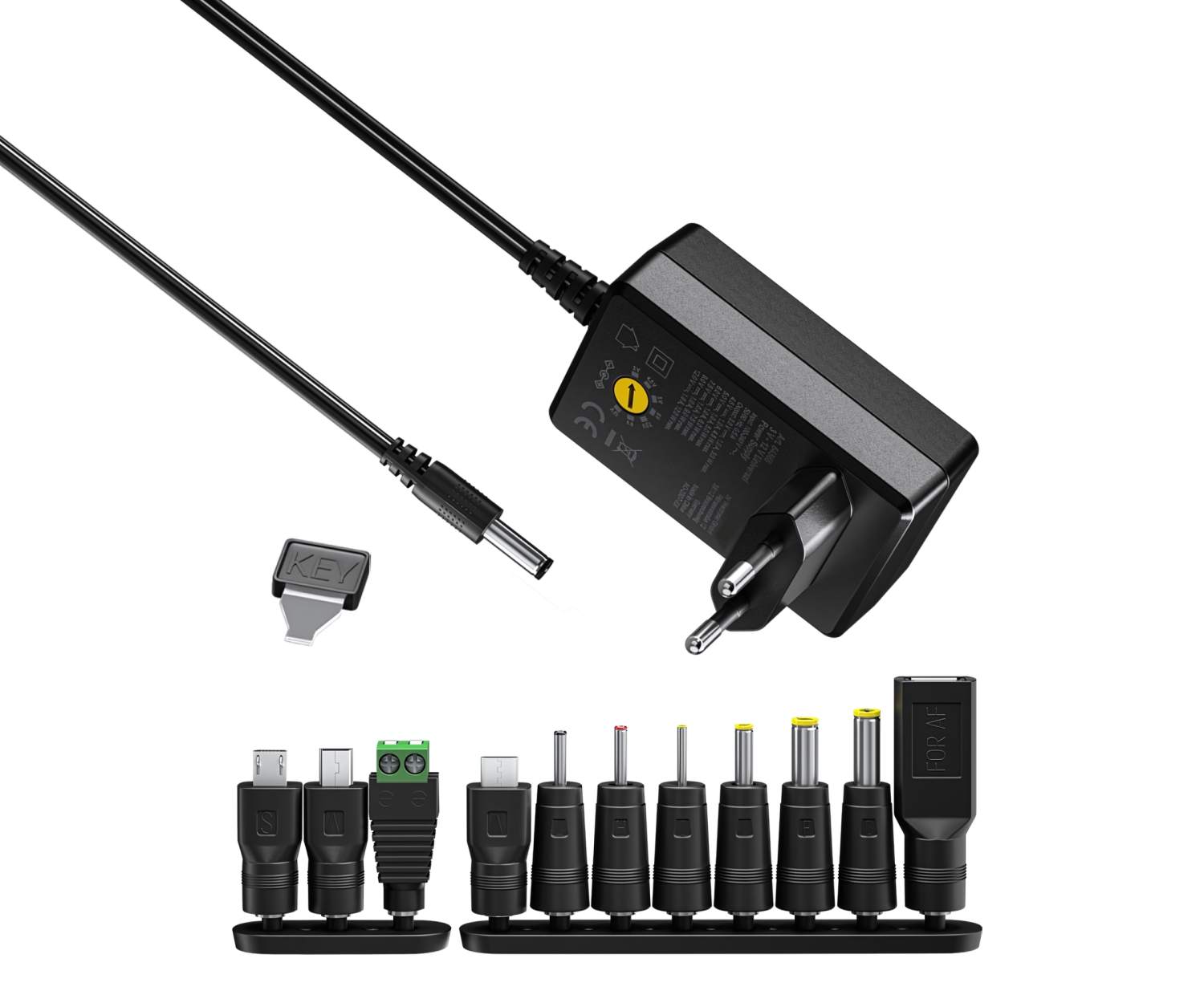 - Napájecí zdroj s proměnným napětím, ideální jako náhradní jednotka pro elektronická zařízení, jako je TV box, router, LED pásky, videokamera, digitální fotorámeček, terč na šipky, chůvička nebo hračka