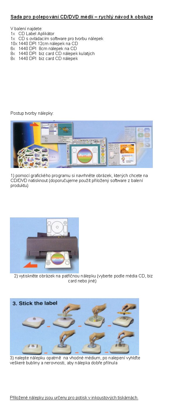 Kompletní sada pro návrh, tisk a přesné vycentrované nalepení etiket na CD nebo DVD disky. Obsahuje aplikátor s velmi jednoduchým použitím a podporou disků o průměru 8 a 12 cm i formátu vizitky, sadu nálepek pro všechny typy disků a výkonný a snadno ovladatelný software pro návrh a tisk etiket na libovolné tiskárně. Celý kit Vám umožní za pár minut vytvořit profesionálně vyhlížející CD disky, je velice vhodný pro prezentační nebo reklamní CD a podobně.