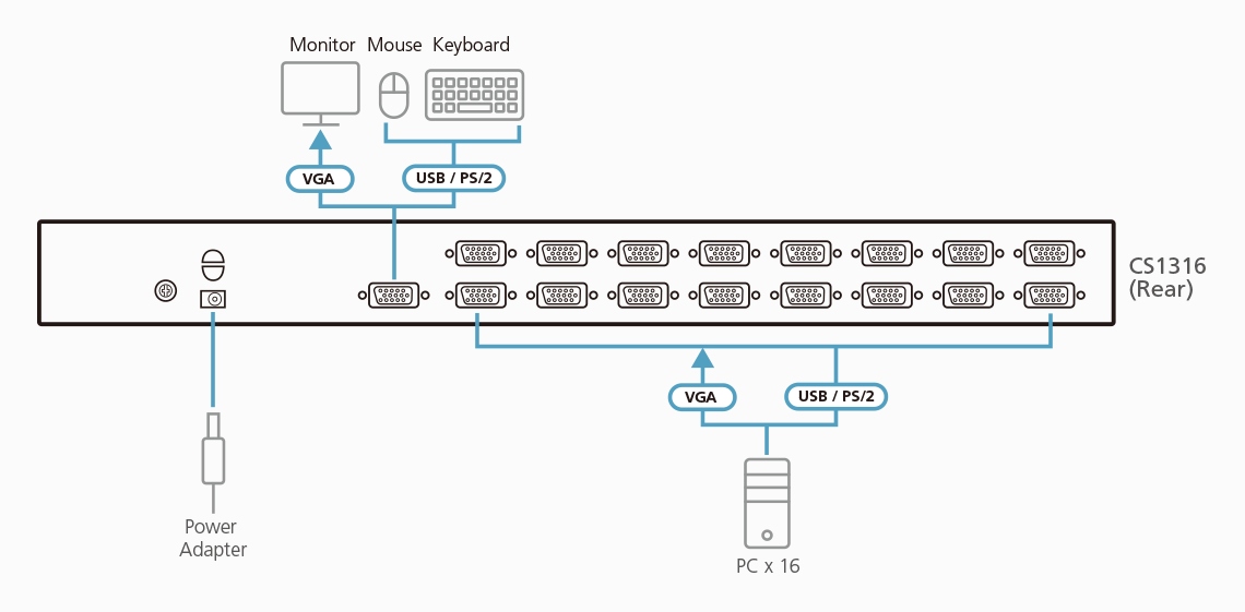 16xPC - 1x VGA + 1x KLÁVESNICE + 1x MYŠ ( vše možno volit USB nebo PS/2)