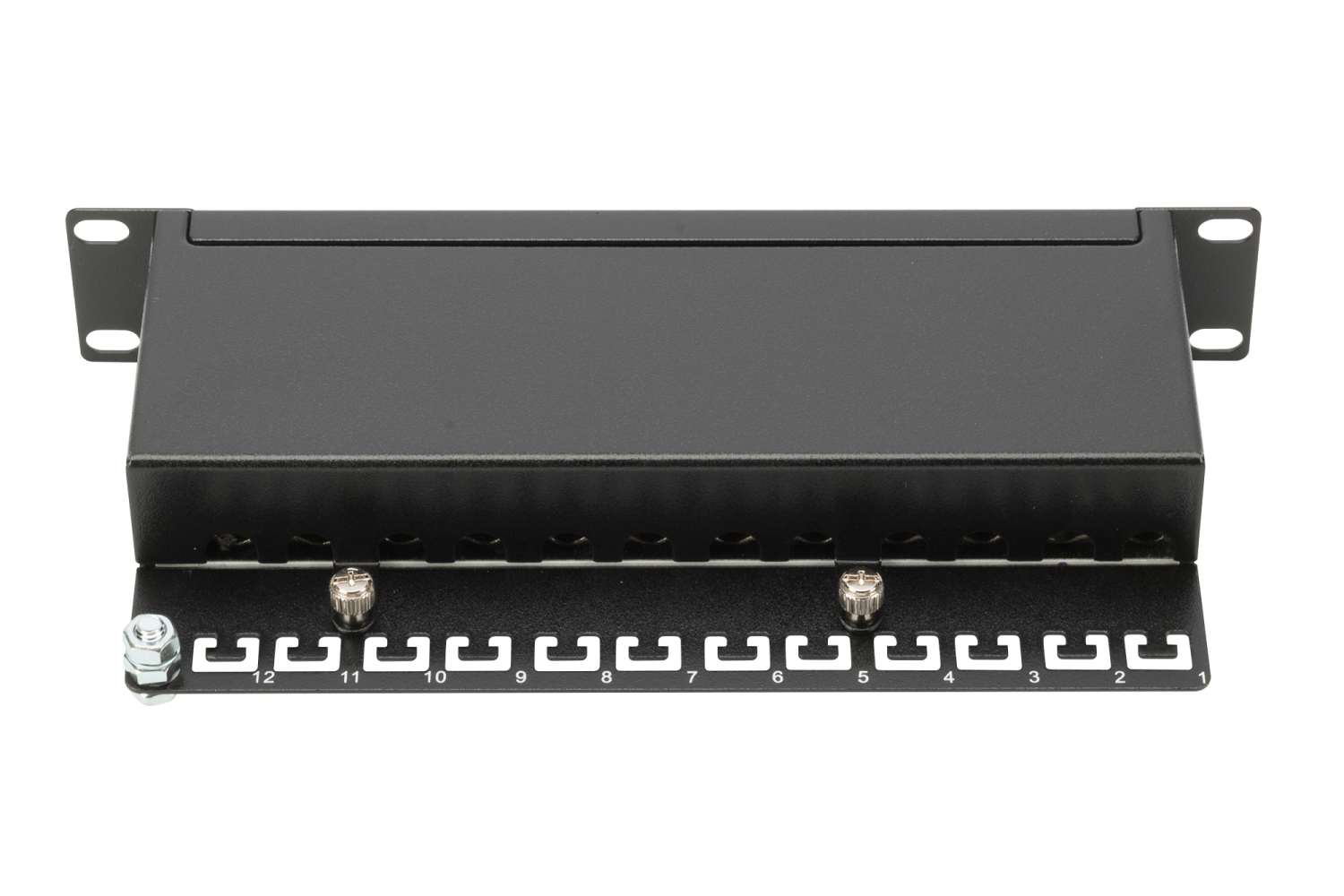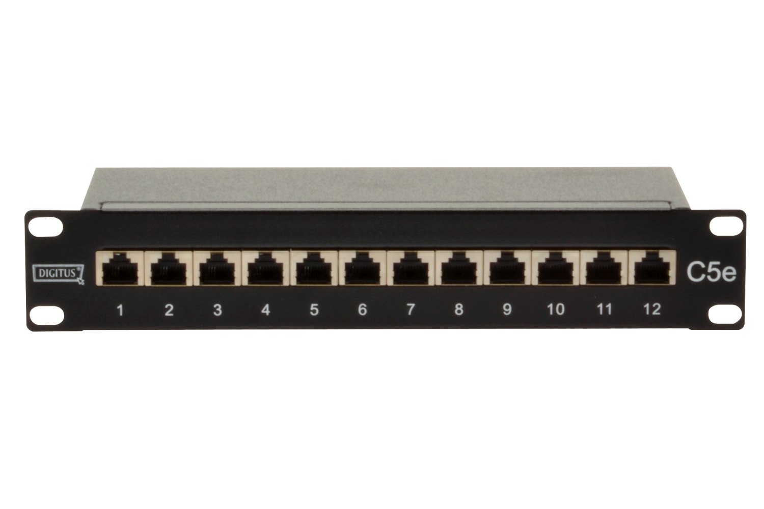 DIGITUS 10" CAT 5e patch panel, stíněný, 12-port RJ45, 8P8C, LSA, 1U, černý RAL 9005