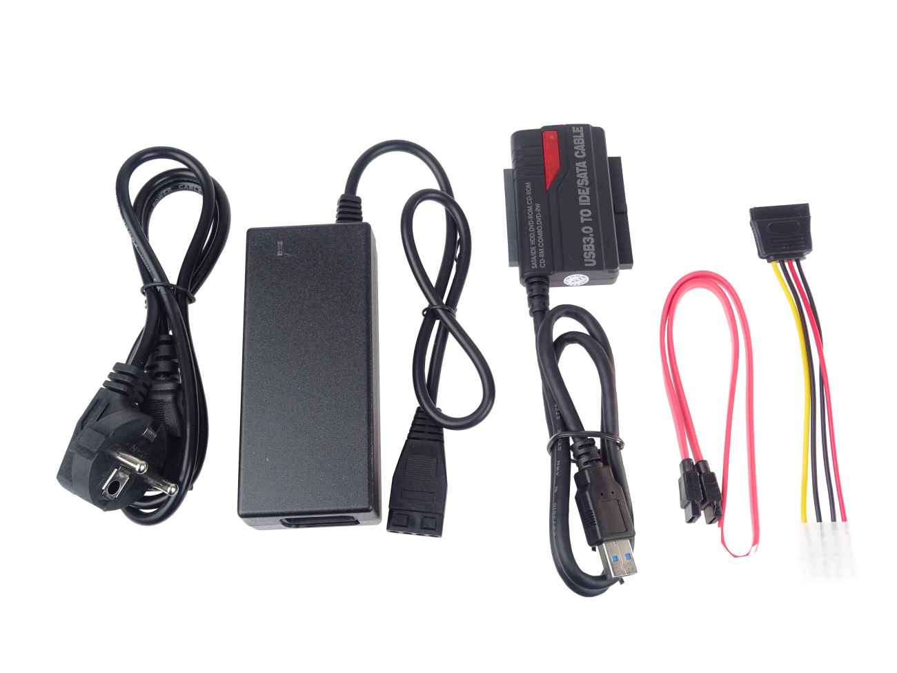 - Kompletní set obsahuje adaptér s kabelem, zdroj 230V/ 5V a 12V pro napájení HDD, SATA kabel, napájecí kabel pro HDD, napájecí kabel 230V