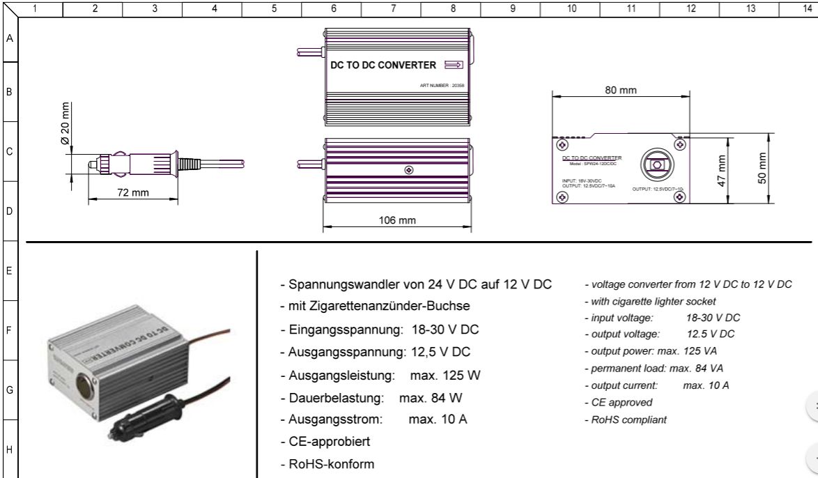- vstupní napětí: 18 - 30V stejnosměrné DC - výstup: 12,5 V stejnosměrné DC - výstupní výkon 84W , maximálně 7A trvale (10A po 10s max.) - konektor do zapalovače v nákladním automobilu - výstupní konektor zapalovač v automobilu - výstupní napětí stabilizované - ochrana proti zkratu - kovové šasi zařízení
