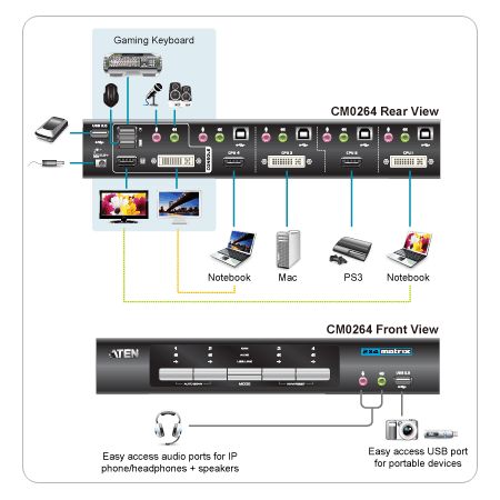 ATEN 4-port KVMP USB HDMI, usb hub, audio