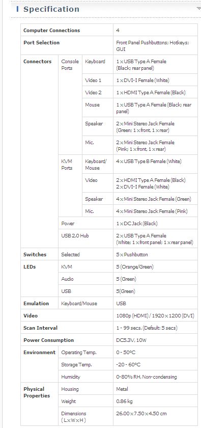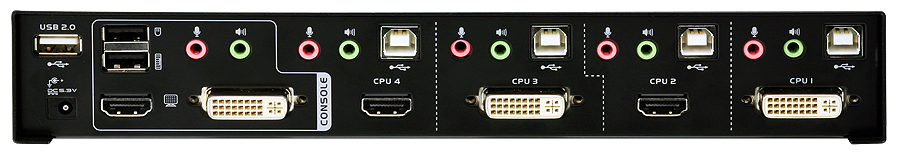 Přepínač umožňuje kontrolovat dva počítače s DVI výstupem a dva počítače/zařízení s HDMI výstupem na jedné konzoli (klávesnice,myš,monitor) s duálním zobrazením videosignálu (zobrazují se výstupy obrazu z dvou připojených počítačů a jeden z nich je možno zároveň ovládat).