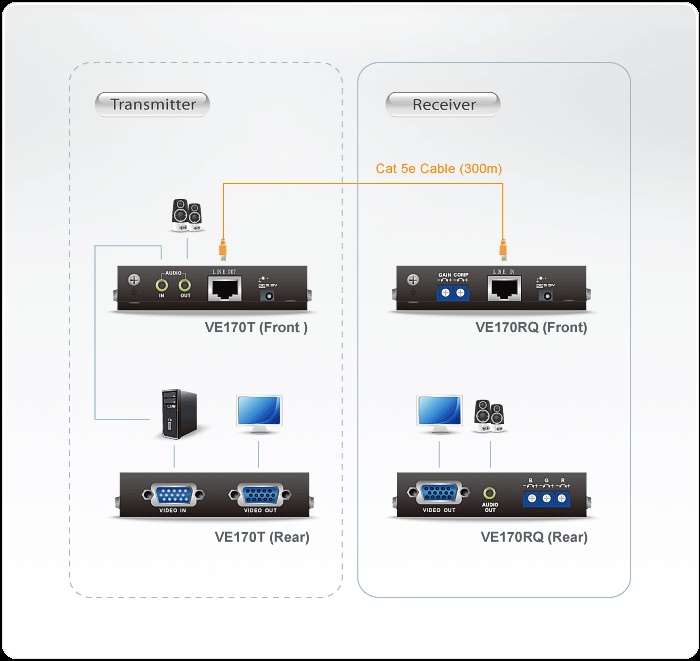 Umožňuje přenášet audio+video signál na velkou vzdálenost až 300m. Signál je veden po kabelu s RJ-45 konektory (není součástí balení). Umožní vzdáleně nebo lokálně zobrazovat signál VGA + audio.