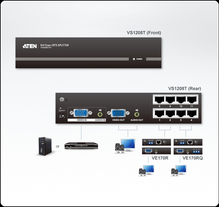 VS-1208T je video/audio rozbočovač, který duplikuje a zesiluje video signál z jednoho vstupu na 8 výstupů