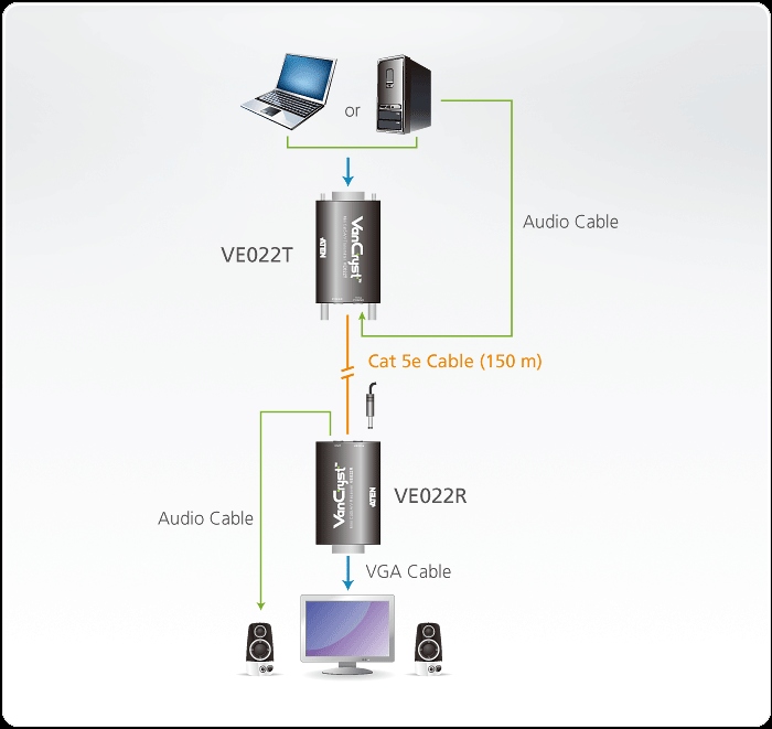 Umožňuje přenášet video signál na velkou vzdálenost až 150m. Signál je veden po kabelu s RJ-45 konektory (, nelze zapojovat do živé sítě!!, kabel není součástí balení). Umožní vzdáleně nebo lokálně zobrazovat signál VGA. Minimalistické provedení zařízení. Zařízení se propojuje Cat5E kabelem s RJ45 konektory mezi jednotkami (není součástí, nesmí být zapojen do živé sítě).