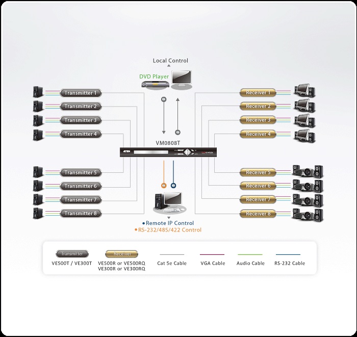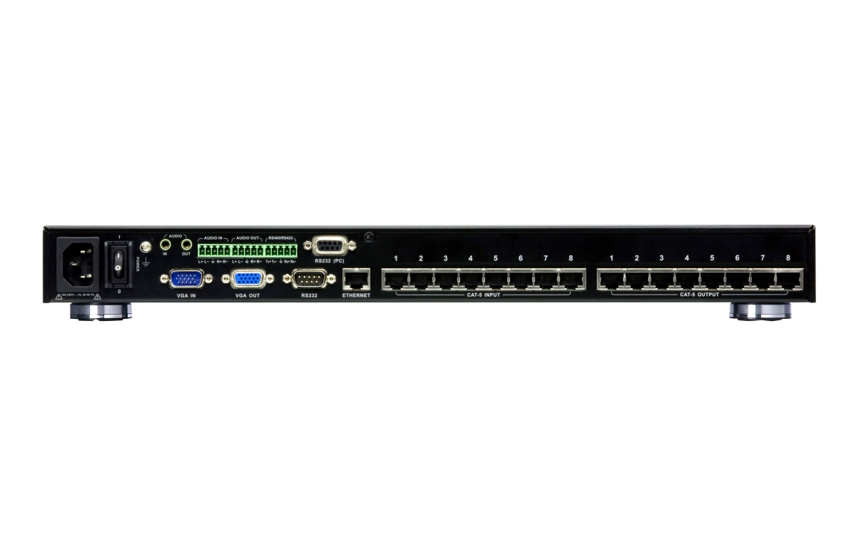 ATEN VM0808T 8x8 Cat 5 A/V Matrix Switch je audio/video přepínač umožňující přepínat z osmi zdrojů video/audio signálu na 8 zobrazovacích jednotek v libovolném pořadí a kombinaci. Používá pro propojení komponent standardní kabel Cat 5 s RJ-45 konektory, nabízí i ovládání po RS-232 portu.