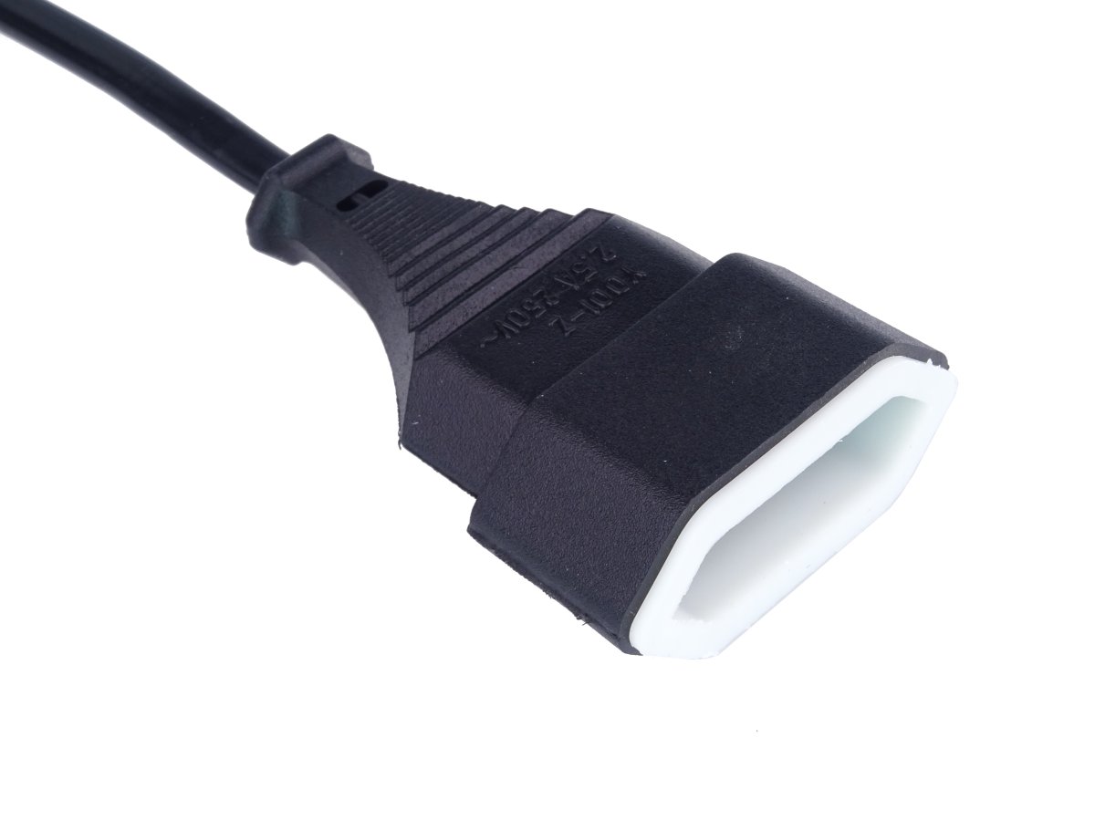 Napájecí kabel 230V v černém provedení se zahnutými konektory 2m. Dvoužilový kabel je zakončený koncem v podobě ležaté osmičky, napětí max.:250V, proudové zatížení: max 2,5A