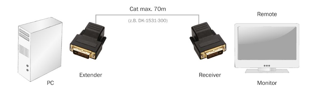 Prodlužka DVI signálu, která používá klasický Cat5 UTP kabel pro prodloužení až na maximální vzdálenost 70m. Skládá se ze dvou modulů (oba v balení).