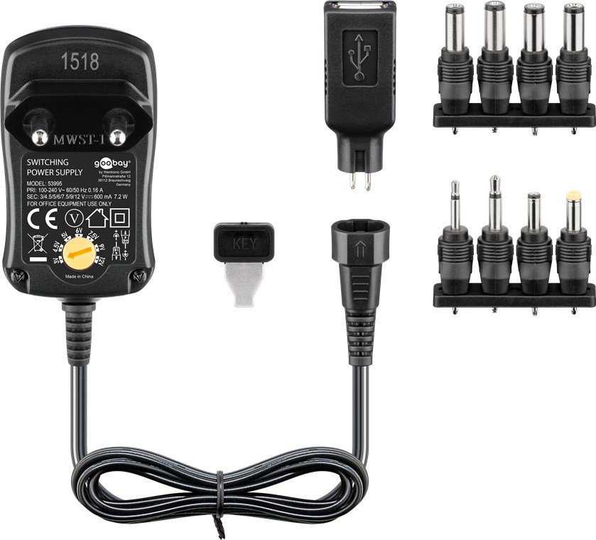 Univerzální napájecí zdroj 3 V - 12 V, maximální výkon 3,6 W / 0,3 A, včetně 11 adaptérů: 7 DC adaptérů plus USB-C™, USB-A, USB Mini-B, Micro-USB a šroubovací svorkovnice, napětí:3 V/4,5 V/5 V/6 V/7,5 V/9 V/12 V při 0,3 A.