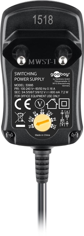 Univerzální napájecí adaptér 230V/3-12V po krocích, stejnoměrných DC, možnosti nastavení na: 3/4.5/5/6/7.5/9/12 V DC výstupní napětí, max.proud 600mA 12VA, 6ks různých výměnných koncovek, vyhovuje normám EU - EuP 2nd stage compl.