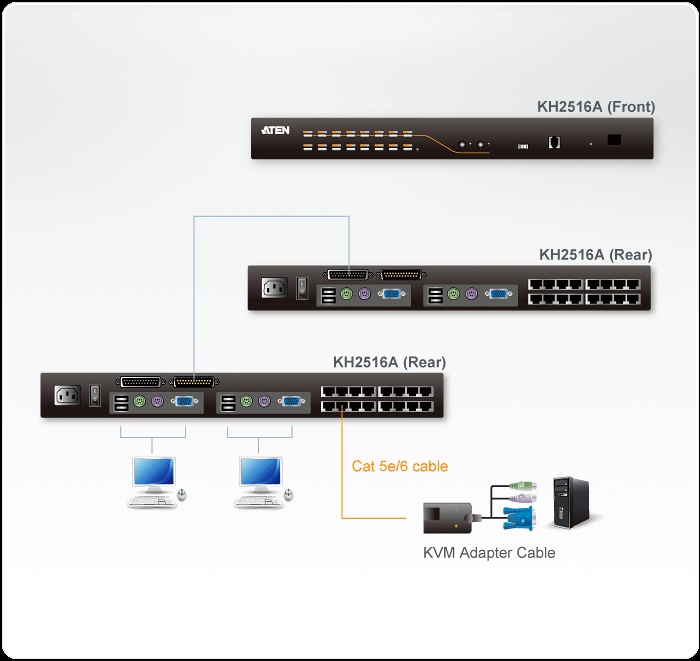 - vzdálenost mezi PC a KVM může být 50m pro rozlišení 1280 x 1024 @ 75Hz při použití adaptérů řady KA7000