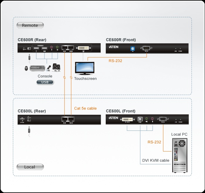 Zařízení umožní připojit konzoli (klávesnice/monitor/myš) až na vzdálenost 60m, na zařízení je také port RS-232 pro možnost ovládání např. sériového terminálu či dotykové obrazovky nebo čtečky čarových kódů na vzdáleném pracovišti..
