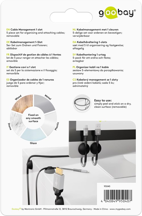 - zabrání kroucení kabelů - doporučená maximální délka přichycovaného kabelu: 2,5 m - zátěž až 75 kg - možno vícekrát použít - po odstranění nezanechává žádné stopy