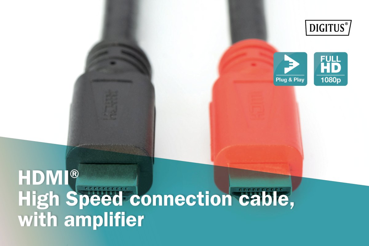 DIGITUS HDMI 3D propojovací kabel s integrovaným zesilovačem,20m, AWG28, 2x stínění, M/M, UL, zlacené konektory, černý