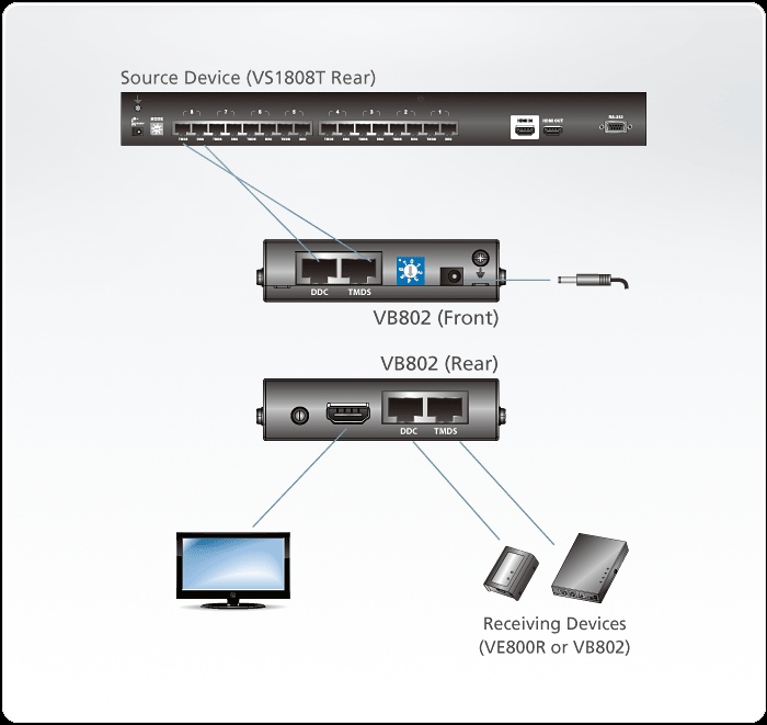 VB802 HDMI Over Cat 5 Repeater je zesilovač HDMI signálu, kompatibilní se zařízeními ATEN HDMI pro přenos / prodloužení / rozdělení signálů po Cat 5 kabeláži. VB802 rozšíří zesilovaný signál po Cat 5 na dalších extra 60m vzdálenosti ke standardnímu rozsahu po 2 Cat 5 kabelech. Použití tohoto zesilovače umožní extra prodloužení vzdálenosti mezi jednotkami HDMI extenderů apod., které používají na propojení lokální/vzdálené jednotky 2x kabel Cat 5. Zařízení není samostaně funkčním celkem (je nutno ho používat s extenderem/spliterem po 2x Cat 5 apod.)