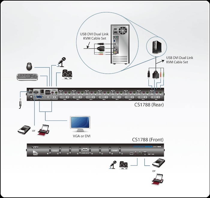 CS1788 USB DVI Dual Link KVMP přepínač kombinuje funkce 8 portového KVM přepínače a 2 portového USB Hubu s obrazem digitální kvality DVI a 2.1 kanálovým audiem. Jedna USB konzole s DVI (VGA) monitorem kontroluje až 8 PC (DVI/VGA).