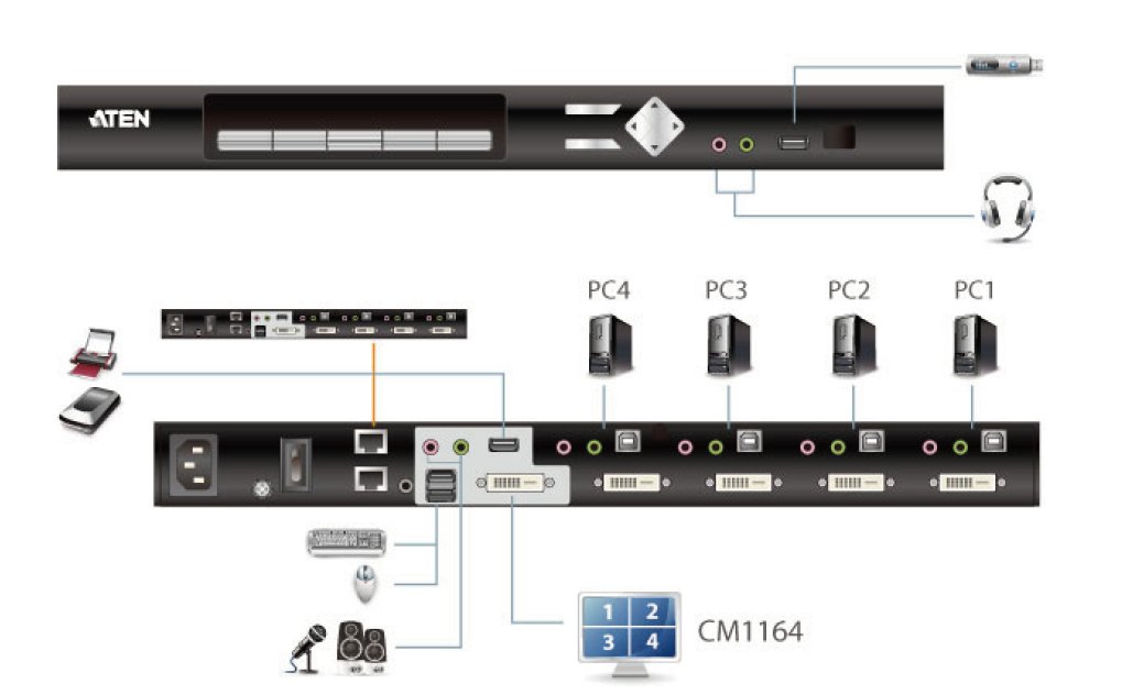 CM1164 KVMP přepínač kombinuje funkce 4-portového KVM přepínače a 2 portového USB Hubu s obrazem digitální kvality DVI a audiem. Jedna USB konzole s DVI monitorem kontroluje až 4 PC. Přepínač navíc umožňuje sledovat všechny obrazy z připojených přepínačů na jedné obrazovce najednou nebo použít funkci Picture in Picture (obraz v obraze).