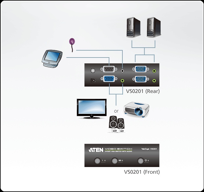 Přepínač Aten VS-0201 umožní připojit 2 zdroje signálů VGA a audia a přepínat je na 1 zobrazovací jednotku(monitor). Zařízení je vhodné např. na prezentace nebo do výcvikových objektů.