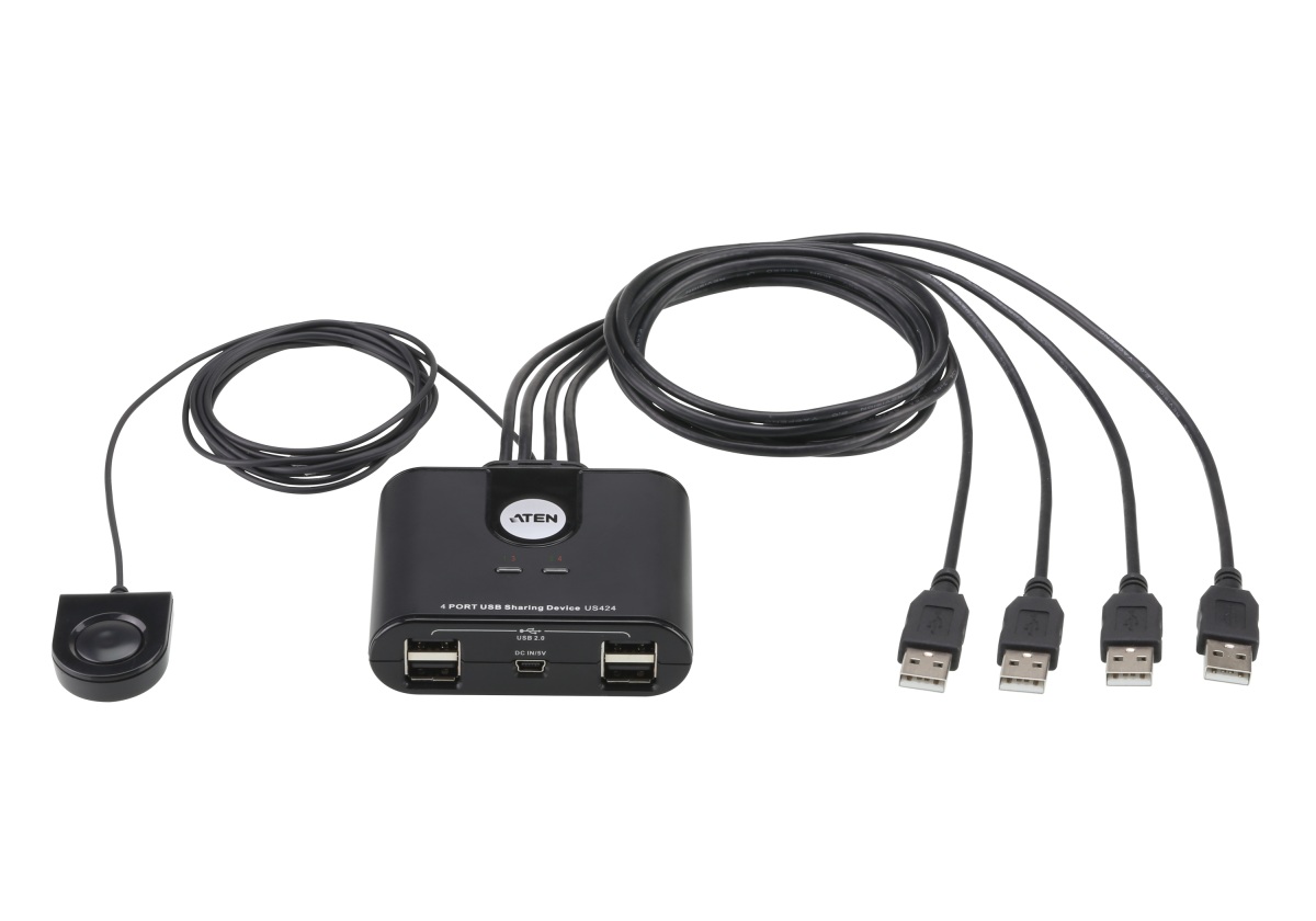 Aten US424 umožní sdílení USB periferií mezi počítači. Umožní čtyřem počítačům sdílet až 4 USB 2.0 zařízení. Pěkný a malý design, díky kabelům vše v jednom.