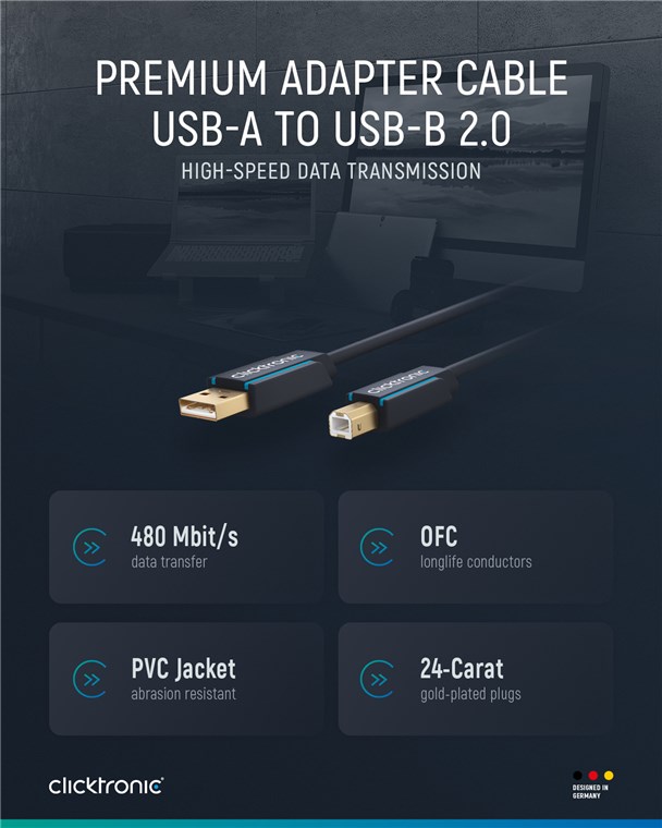 Kabel přenáší data z různých HDD, tiskáren, tabletů, kamer a dalších periferií. USB 2.0 rozhraní umožní rychlost až 480 Mbps. Kabel je velice kvalitní, dvojitě stíněný z bezkyslíkaté mědi.