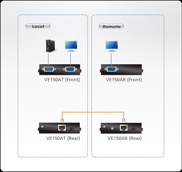 Aten VE-150A je VGA video extender pro prodloužení signálu VGA až na vzdálenost 150m. Umožní připojit lokální monitor a vzdálený monitor (až do 150m) přes Cat5e kabel. Maximální podporované rozlišení signálu 1920x1200 bodů do 30m.