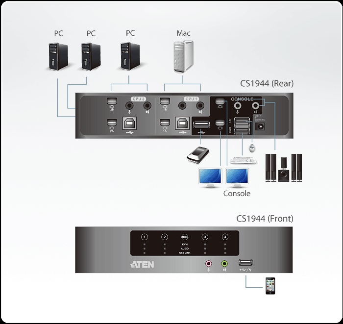 Aten CS1944 4-port USB 2.0 Dual View Mini DisplayPort KVMP přepínač umožní jednomu uživateli sdílet až čtyři připojené počítače za pomocí jedné klávesnice, myši, dual view monitoru.