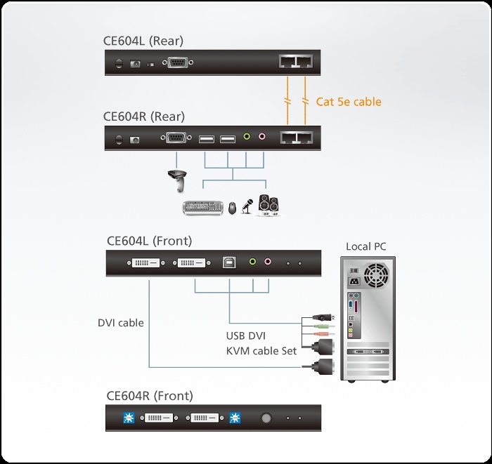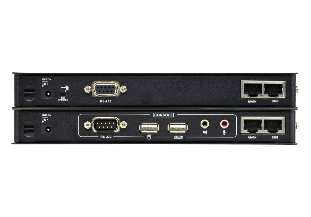 Zařízení umožní připojit konzoli (klávesnice/monitor/myš) s dvěmi monitory až na vzdálenost 60m, na zařízení je také port RS-232 pro možnost ovládání např. sériového terminálu či dotykové obrazovky nebo čtečky čarových kódů na vzdáleném pracovišti.. Zařízení se propojuje 2xCat5E kabelem s RJ45 konektory mezi jednotkami (není součástí, nesmí být zapojen do živé sítě).