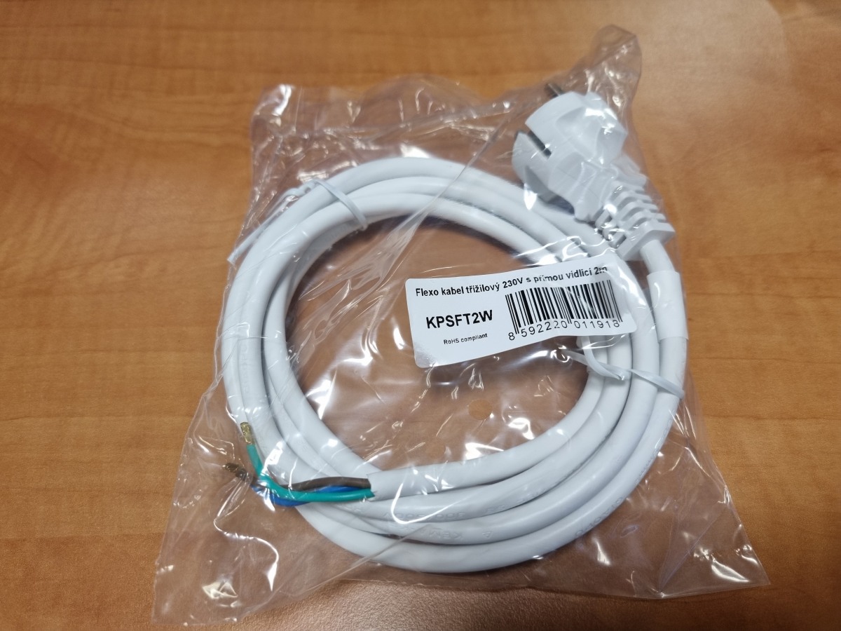 Třížilový kabel je zakončený standardní přístrojovou úhlovou zástrčkou a na druhém konci volné tři vodiče.