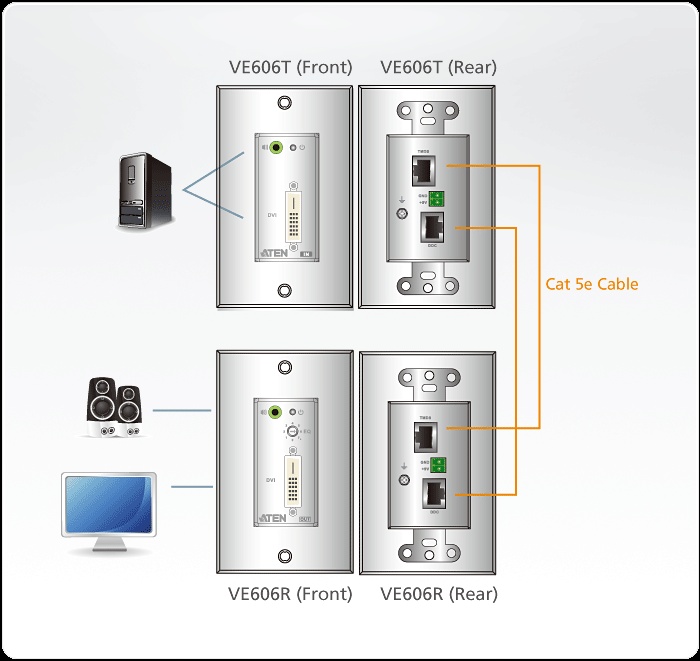 Zařízení se propojuje dvěmi Cat5E kabely s RJ45 konektory mezi jednotkami (není součástí, nesmí být zapojen do živé sítě).