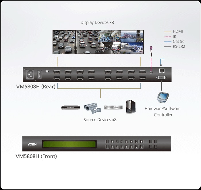 Umožní připojit 8 HDMI zdrojů k 8 HDMI zobrazovačům v jakékoliv kombinaci vstupů/výstupů až na vzdálenost 15m. Vestavěný scaler pro zvýšení rozlišení obrazu a jeho kvality a přizpůsobení obrazu pro nativní rozlišení zobtrazovací jednotky.