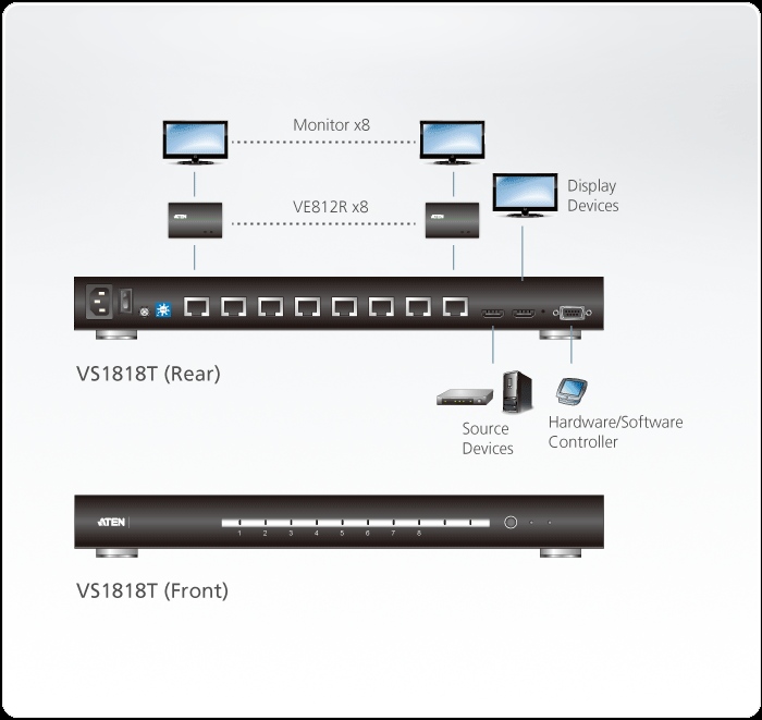 Rozbočovač Aten VS-1818T je nejrychlejším a nejefektivnějším způsobem jak dostat HDMI multimediální obsah a HDCP informace ze vstupu signálu (počítač, přehrávač....) až na 8 zobrazovacích zařízení (monitor, projektor...) HDMI současně.