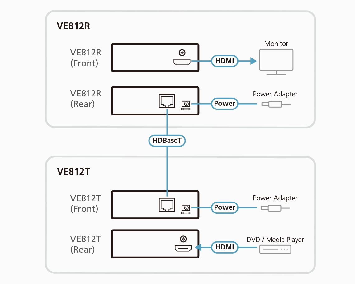 VE812R Aten HDMI Extender umožňuje prodloužení videosignálu HDMI na vzdálenost až 100m po kabelu cat5e/cat6.