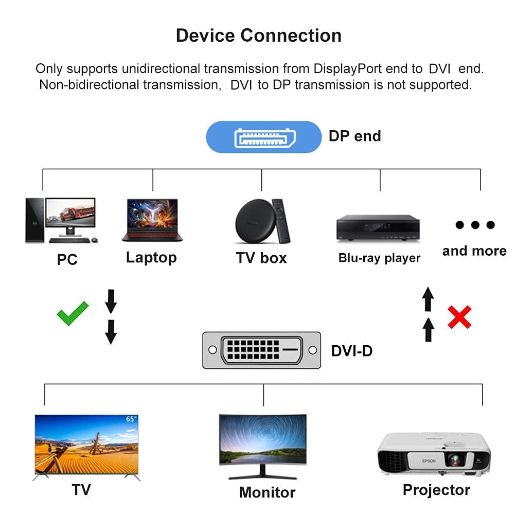 Kabel DisplayPort - DVI funguje jednosměrně, kabel uvnitř obsahuje elektronický převodník DP -> DVI, který dokáže konvertovat signál pouze ve směru DP -> DVI.