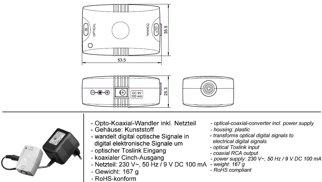 Převádí optický digitální signál (Toslink) na digitální koaxiální signál (coaxial SPDIF) s konektorem RCA(cinch).