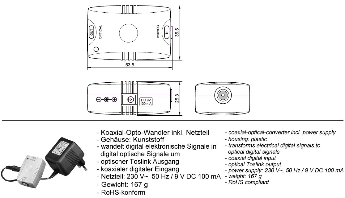 Převádí digitální koaxiální signál (coaxial SPDIF) s konektorem RCA(cinch) na optický digitální signál (Toslink)