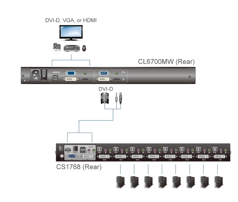 CL6700MW je LCD konzole s rozhraním videa DVI a podporou maximálního rozlišení 1920 x 1080 @60Hz a monitorem 17.3" širokoúhlým, plnohodnotnou klávesnicí a touchpadem. Konzole umožňuje montáž do racku 19", zabíra výšku 1U, podporuje audio. Je vhodná pro použití v kombinaci s DVI KVM přepínačem nebo jako samostatná zobrazovací jednotka. Na zadním panelu jsou k dispozici porty pro další extra konzoli (USB myš a klávesnice, DVI a VGA monitor), na předním panelu najdete port USB pro externí myš. Přepínač umožňuje připojení všech typů zdrojů videosignálu: VGA, DVI a HDMI.