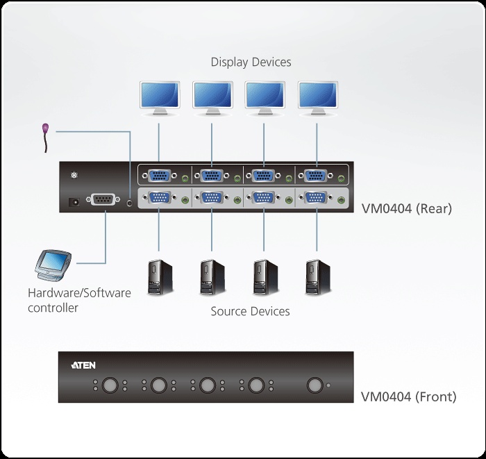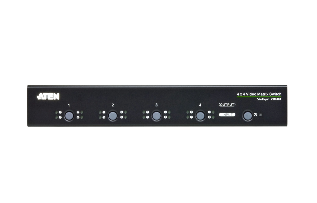 Přepínač Aten VM0404 4x4 umožní připojit 4 zdroje signálů VGA a přepínat je na 4 zobrazovací jednotky najednou. Umožní přepínat z jakéhokoliv zdroje na jakýkoliv monitor (nebo na všechny 4 najednou). Umožní použít až 30m dlouhé VGA kabely, má RS232 port pro vzdálené ovládání. Zařízení je vhodné např. na prezentace nebo do výcvikových objektů.