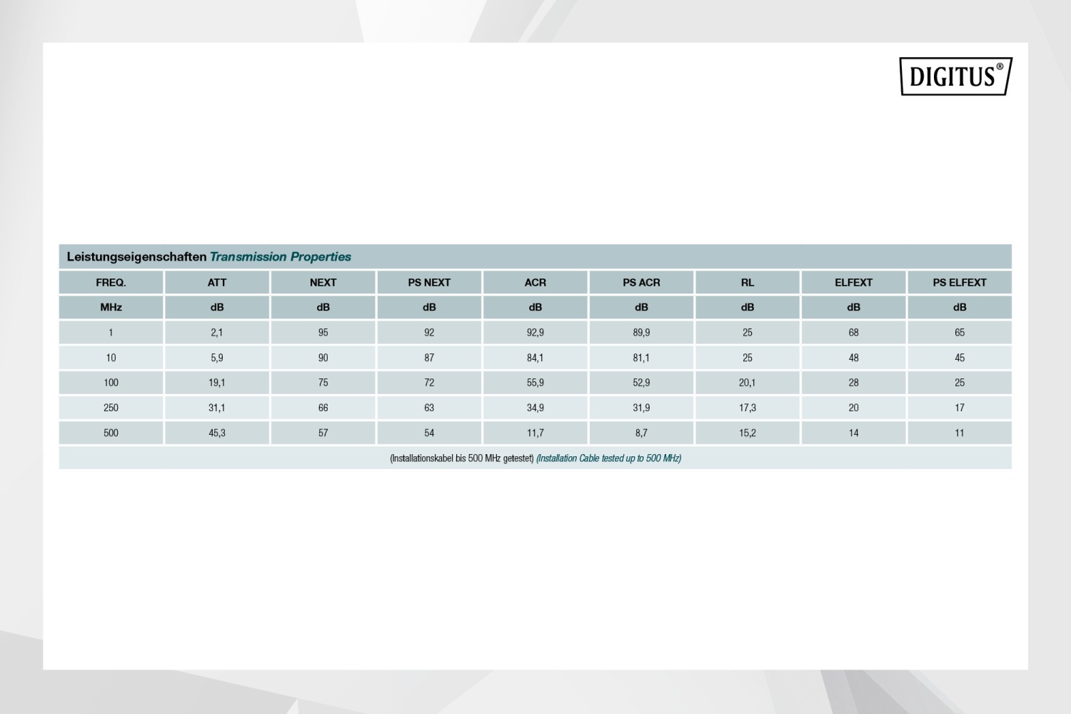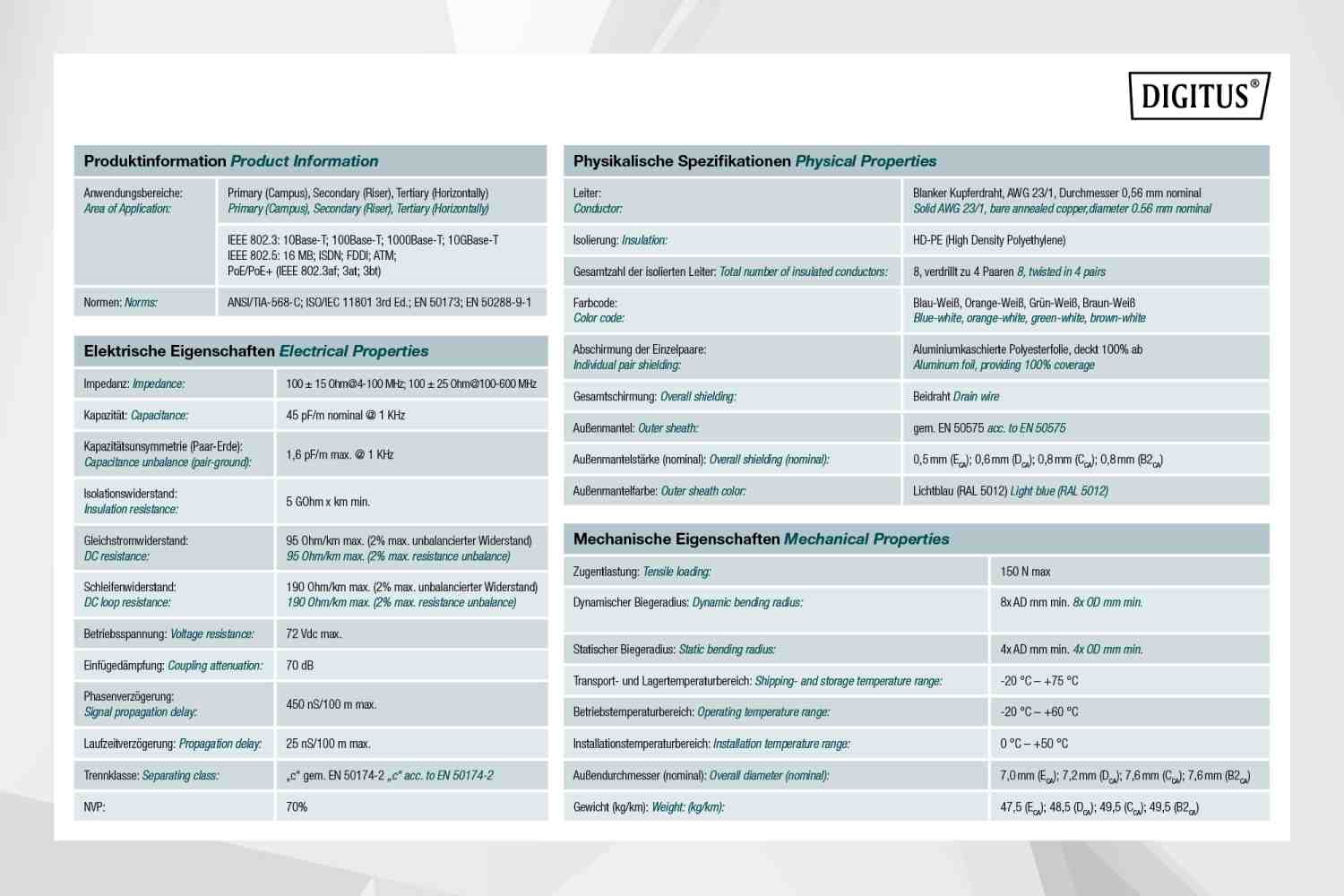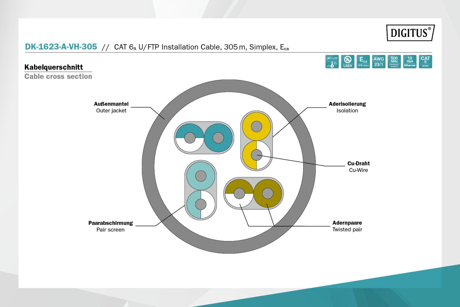- Kategorie CAT6A vyhovuje normě ISO/IEC 11801, TIA/-586-C.2, EN 50173