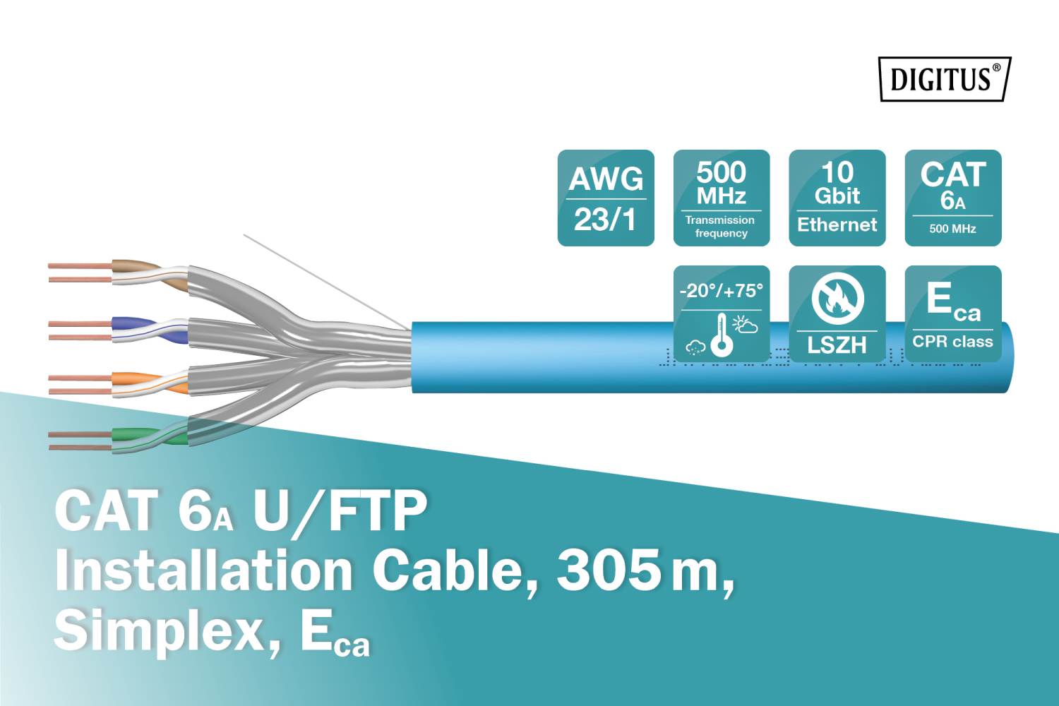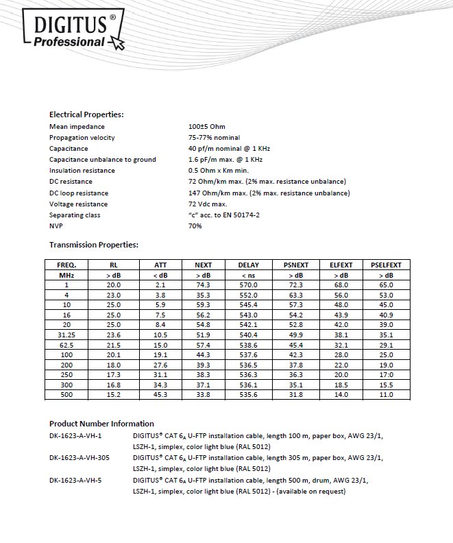 Instalační kabel CAT6A zaručuje dlouhou životnost, maximální výkon a bezproblémový chod počítačové sítě. Instalační kabel - CAT6A je určený pro horizontální rozvody a bez problémů splňuje požadavky definované v mezinárodních standardech ISO/IEC 11801, TIA/-586-C.2, EN 50173 pro CAT6A a je proto vhodný i pro provoz těch nejnáročnějších protokolů určených pro strukturovanou kabeláž.