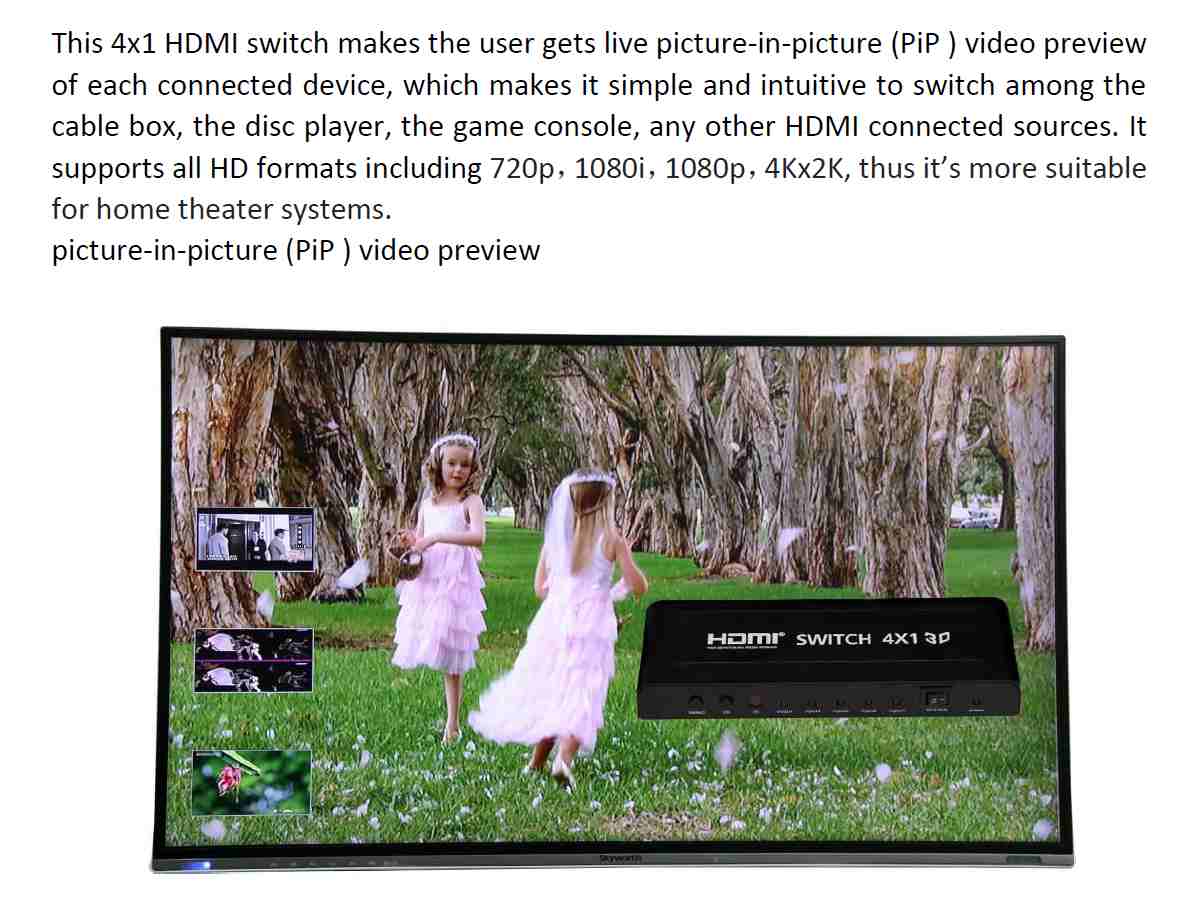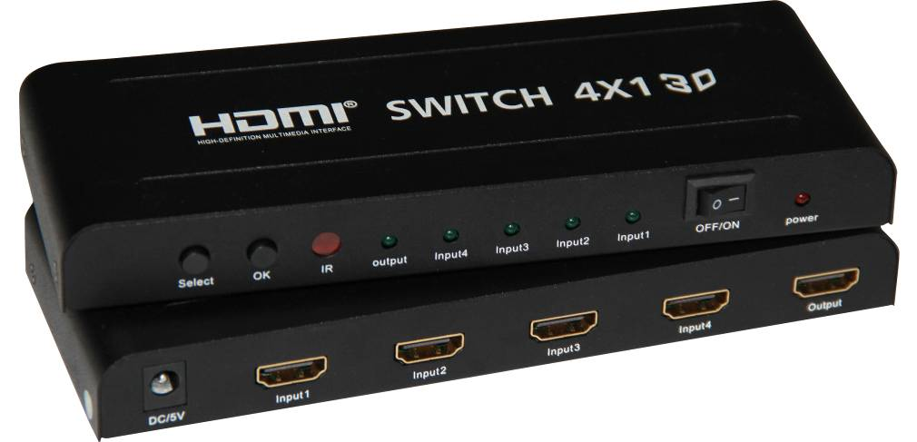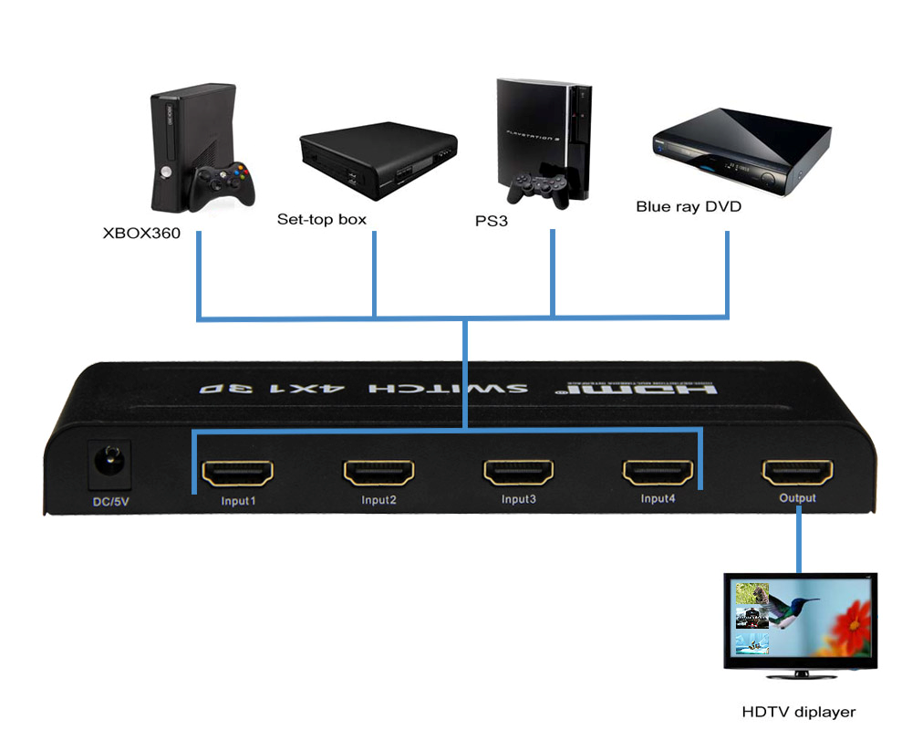 4 HDMI zařízení sdílí 1 HDMI výstupní zařízení (obrazovku). Výběr zařízení tlačítkem nebo dálkovým ovládáním.