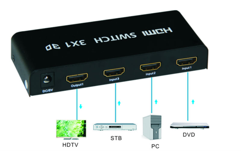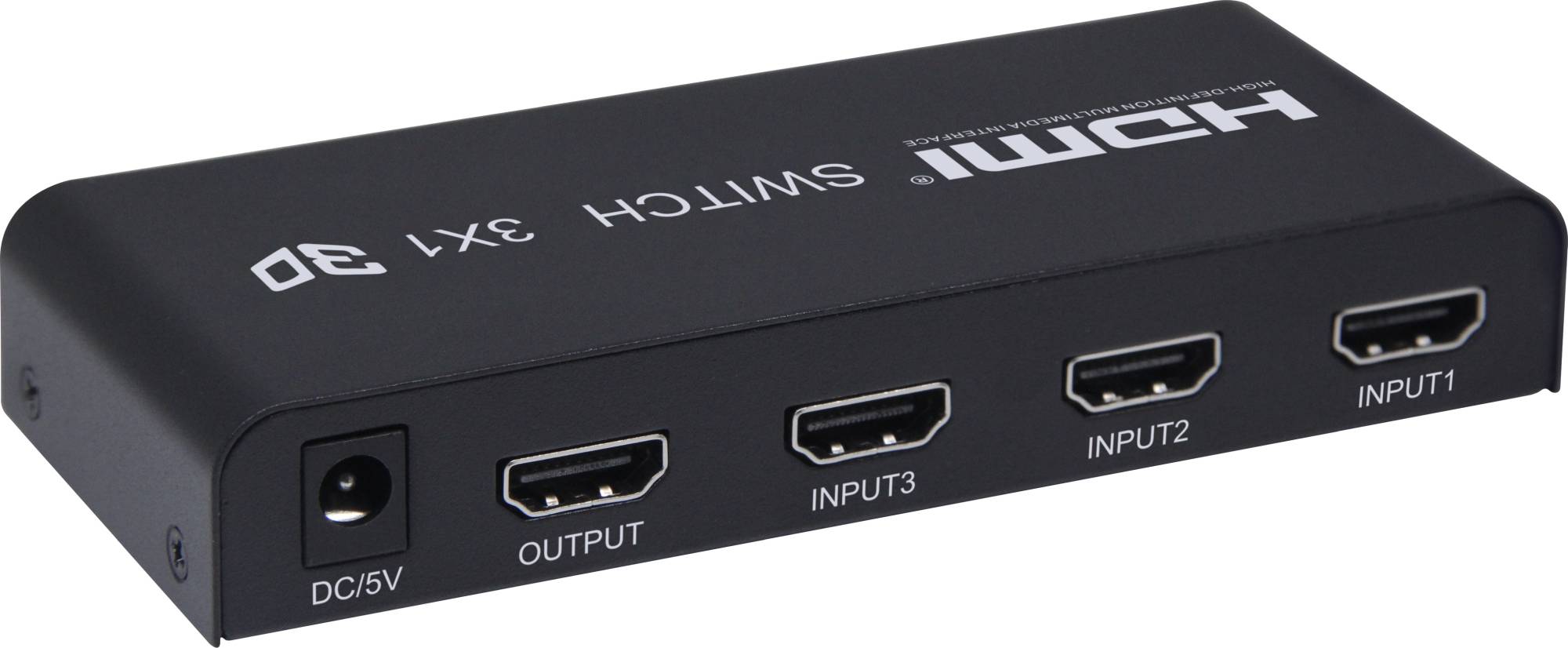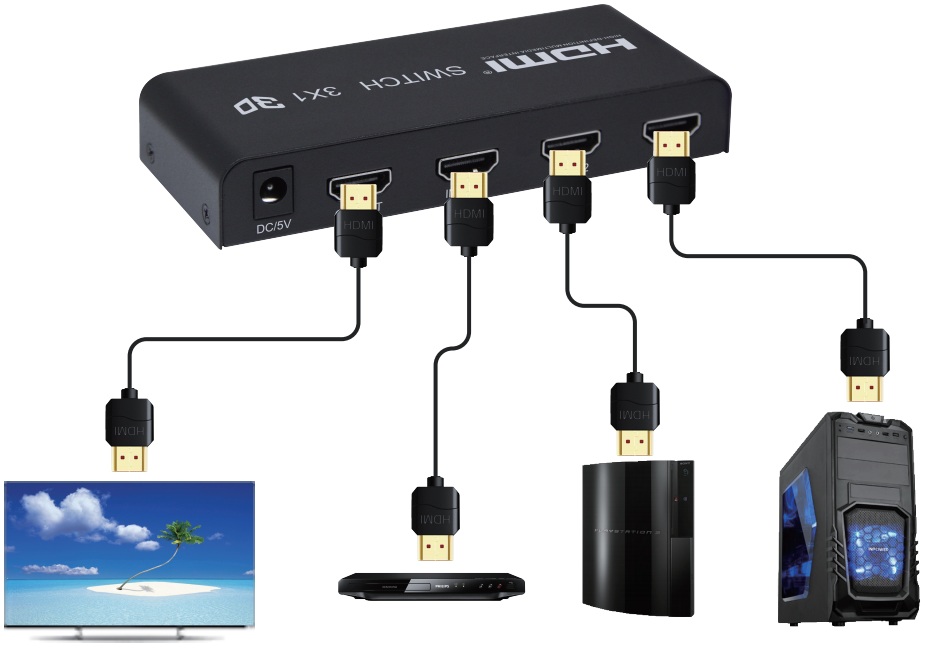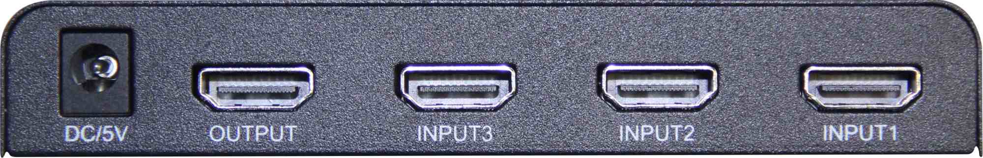 3 HDMI zařízení sdílí 1 HDMI výstupní zařízení (obrazovku). Výběr zařízení tlačítkem nebo dálkovým ovládáním.