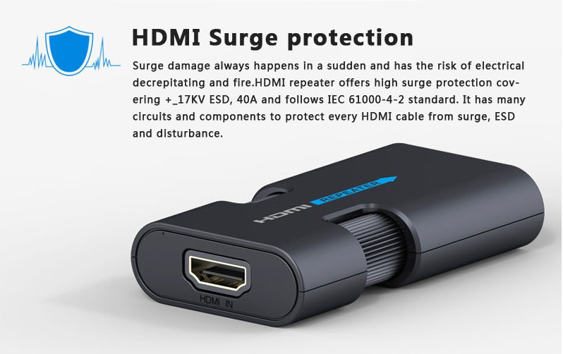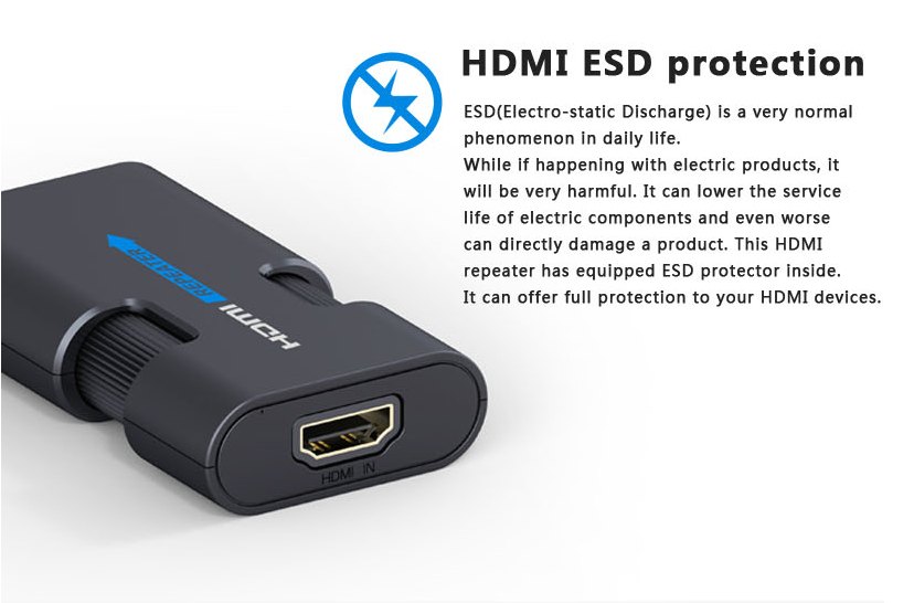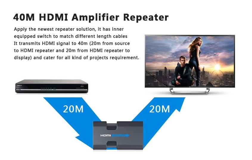 - Zapojuje se většinou do prostřed trasy mezi dva kabely, například mezi dva 20m kabely,viz příklad zapojení níže, proto konektory repeateru jsou female-female ( doporučené provedení 20m HDMI kabelu, měděný vodič 24AWG )