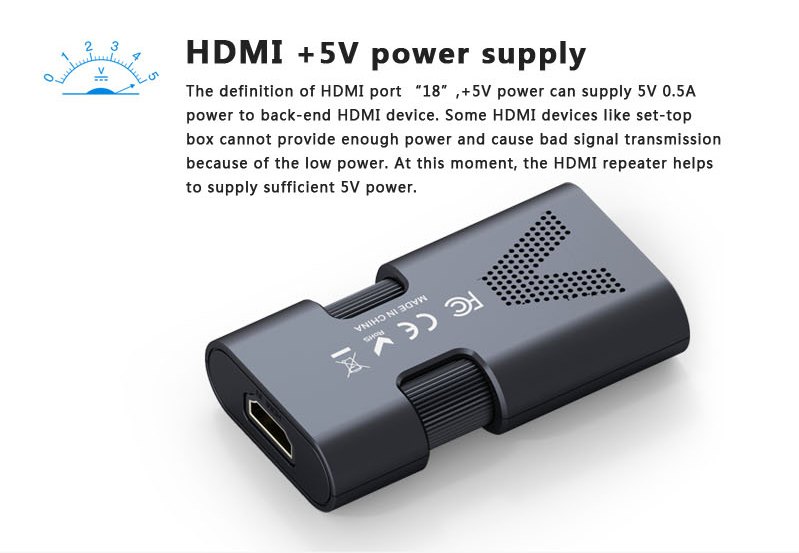 - Nevyžaduje napájení, je napájen s HDMI sběrnice, v případě, že HDMI sběrnice nedává dostatečný proud pro napájení extenderu, potom je nutné extender napájet 5V přes micro USB konektor.Toto napájení je možné realizovat z USB portu kabelem s micro USB konektorem nebo nabíječkou 230V s výstupním konektorem micro USB.