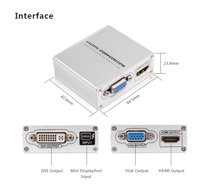 - Tři výstupní konektory:HDMI + DVI + VGA (Female)